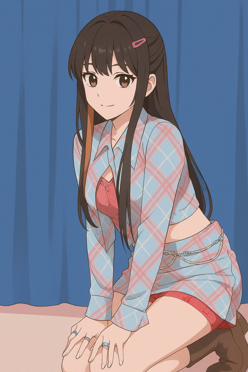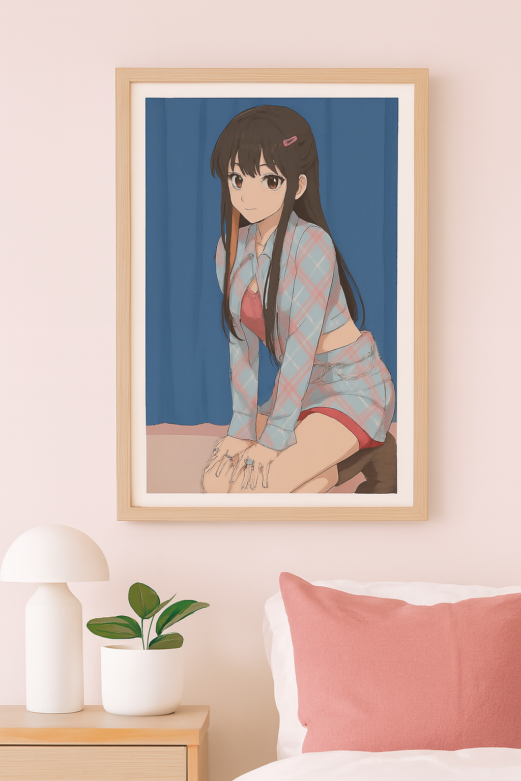 A quiet moment captured in soft tones and gentle posture. “Plaid Reverie” blends pastel textures with a serene pose, featuring a coordinated plaid outfit, plush floor setting, and a subtle gaze that invites reflection. Printed on museum-grade matte paper using archival inks, this piece brings warmth and character to any space.